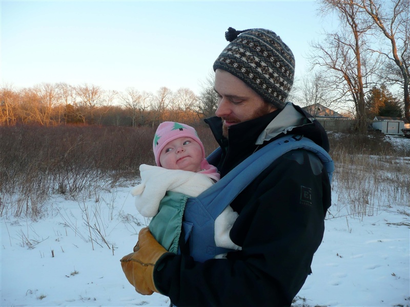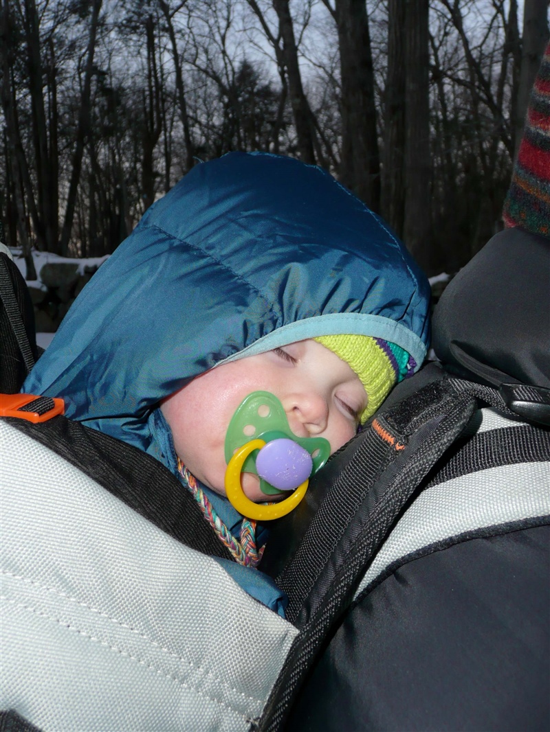 A beautiful sunset at Weetamoo Woods with Brett, Kim, and Lucy Ana. Nora's digging the new backpack. So much so, she took a nap.